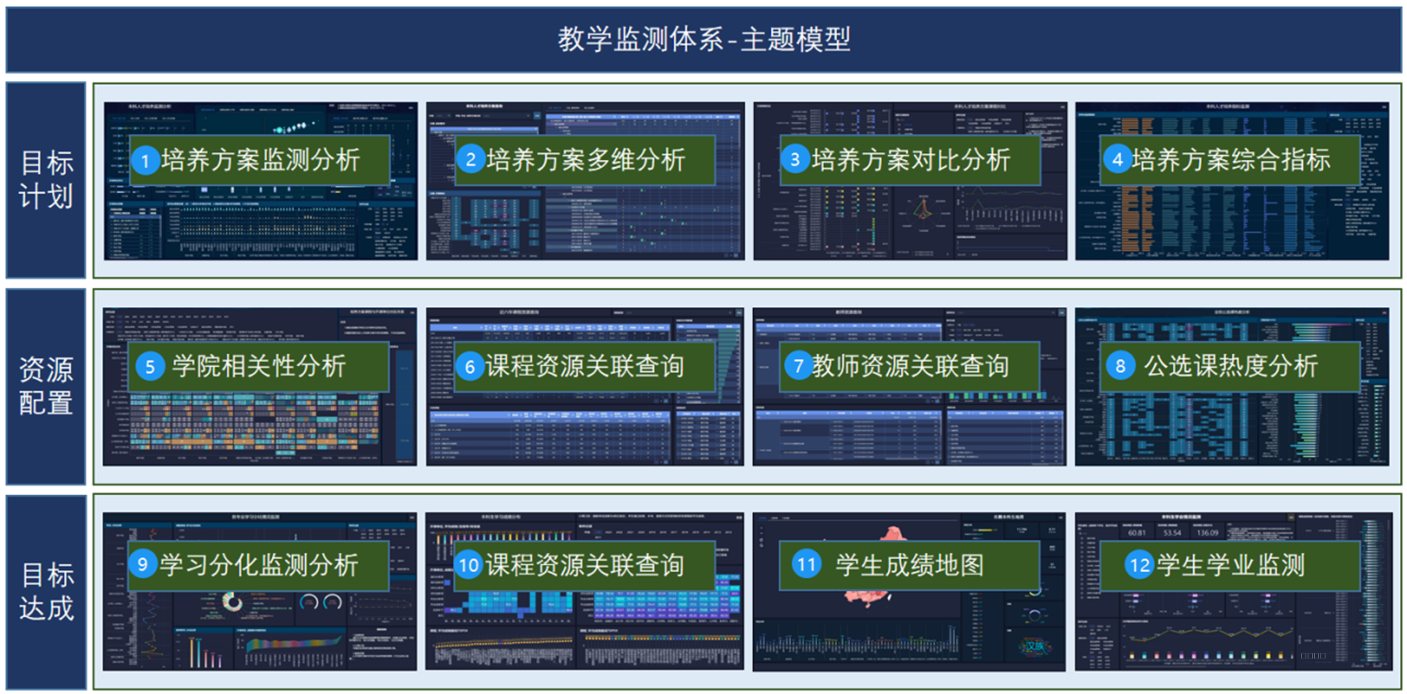 本教学监测主题模型以培养方案为核心,贯通 目标计划→资源配置→目标达成 全链路:
